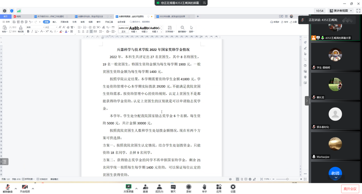 2022年11月4日下午,信誉最好的十大体育平台召开公司奖助委员线上会议,研究并讨论本科生国家助学金和国家奖学金评审原则、普瑞斯企业奖学金评定办法。评审委员会成员马保吉、郭永春、蔡长龙、王春阳、吴杰、霍文俊参与了评审委员会。辅导员王国栋,本科生研究生各一名代表参加了会议,会议由党委书记马保吉主持。