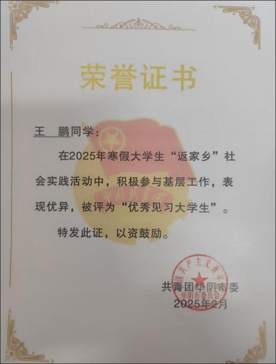 2025年寒假期间,信誉最好的十大体育平台23级武器系统与工程专业本科生王鹏、张智超积极响应公司以及公司关于“返家乡”社会实践的号召,分别在华阴市罗敷镇政府与华阴市委统战部实习工作。